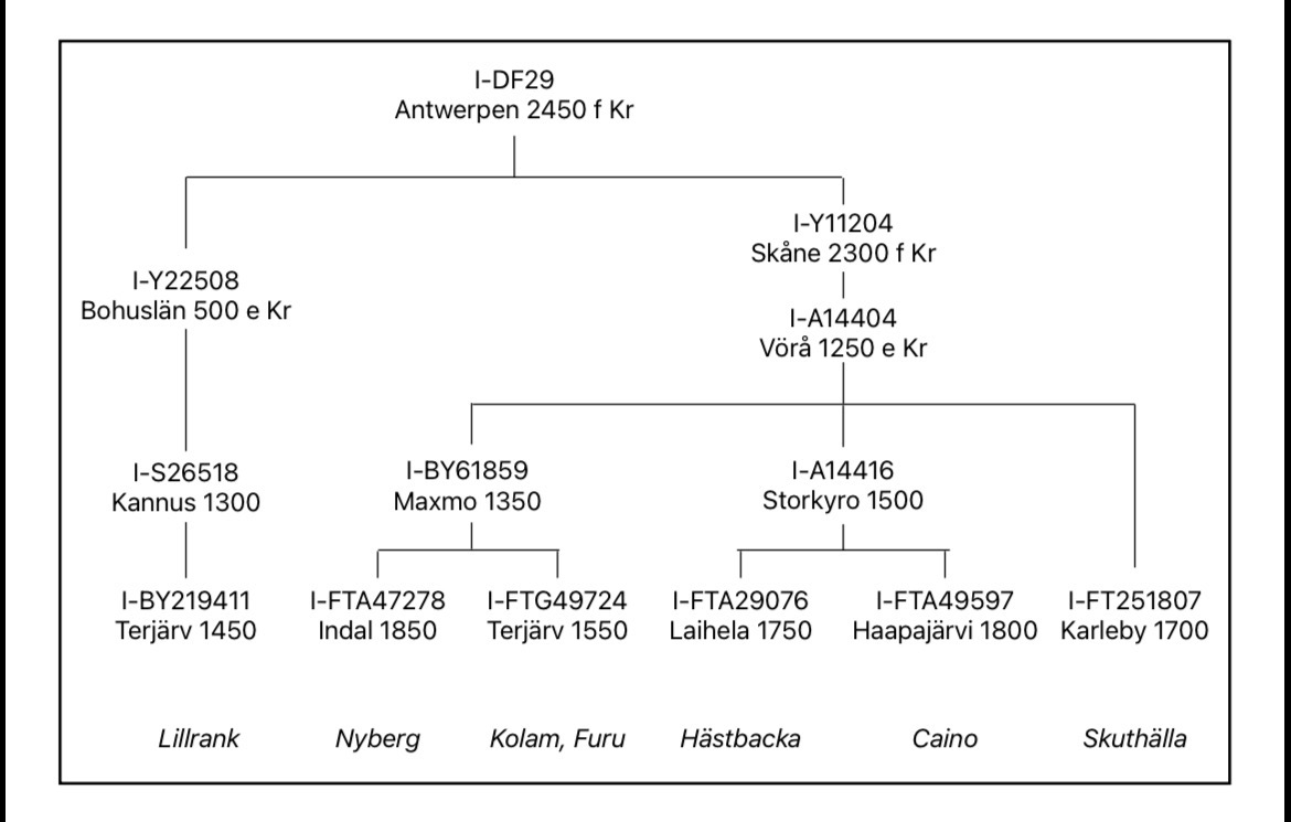 Nu har närbesläktade haplogrupper (N-A13141 med många delningar) påträffats i Skellefteånejden, med en vandringslinje från Borgå, där den skilt sig från ovannämnda ca 700 f Kr och sedan vandrat till Vörå och Nykarleby. Där har den uppehållit sig ett par hundra år kring Kristi födelse, och sedan flyttat vidare runt Bottenviken till Kiruna, därifrån den sedan vandrat söderut. Vi har alldeles nyligen fått kontakt med forskare i Skellefteå, som söker rötter i Finland. Det finns många nya testare av denna gren i Burträsk.