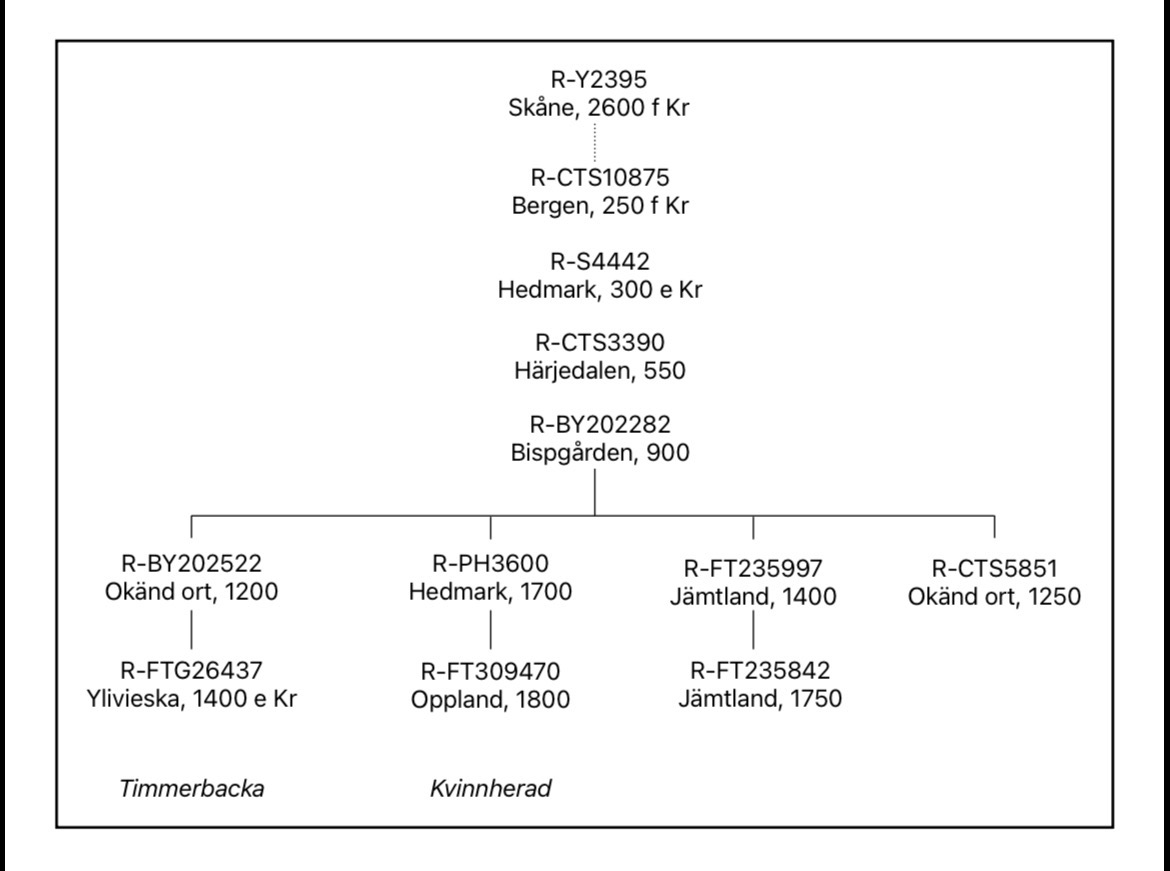 Så har vi ännu Timmerbackalinjen, R-haplogruppen, som har två testade (Djupsjöbacka och Duvnäs) på samma farslinje. Vi har inga nya rön för tillfället. Den sydösterbottniska DNA-gruppen arbetar med rätt många R-testade. De har kommit över havet från södra Norrland. Det finns tydliga kopplingar till Norge under vikingatiden. Jämtland-Härjedalen som finns med längs vägen hörde till Norge på den tiden.