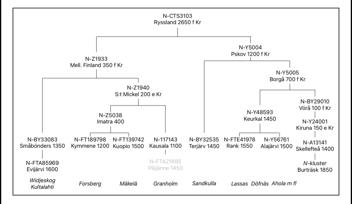 Nu har närbesläktade haplogrupper (N-A13141 med många delningar) påträffats i Skellefteånejden, med en vandringslinje från Borgå, där den skilt sig från ovannämnda ca 700 f Kr och sedan vandrat till Vörå och Nykarleby. Där har den uppehållit sig ett par hundra år kring Kristi födelse, och sedan flyttat vidare runt Bottenviken till Kiruna, därifrån den sedan vandrat söderut. Vi har alldeles nyligen fått kontakt med forskare i Skellefteå, som söker rötter i Finland. Det finns många nya testare av denna gren i Burträsk.